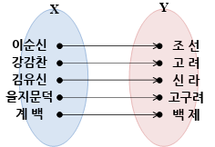 X의 이순신, 김시민, 권율이 Y의 조선에 대응해요. 거꾸로 보면 Y의 조선은 X의 이순신, 김시민, 권율 세 명과 대응하죠.