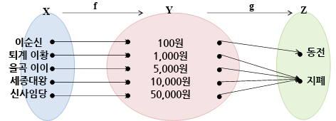 집합 Y의 임의의 원소인 화폐가 집합 Z의 동전인지 지폐인지에 대응하면 이것도 함수죠. 함수 g라고 할게요.